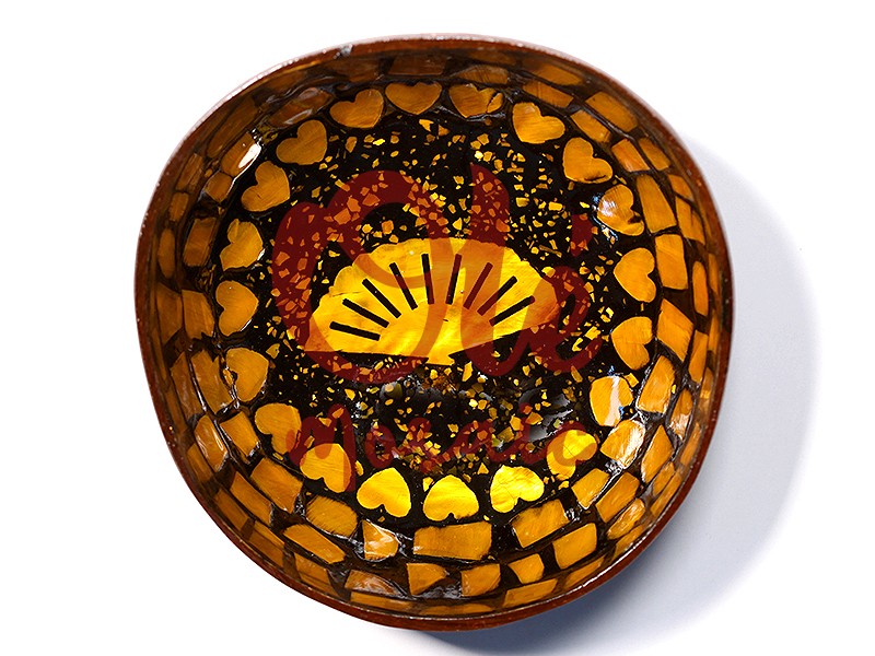 Bol de coco amarillo con un elegante diseño que combina un fondo negro con detalles dorados. Este producto artesanal presenta un motivo de abanico en el centro, rodeado de corazones y elementos decorativos, todo en un estilo vibrante y atractivo. Fabricado en coco, cada bol está diseño artesanal, pintado a mano, lo que realza la maestría de su creación. Ideal para añadir un toque artístico a cualquier espacio, evocando la riqueza del folclore español.