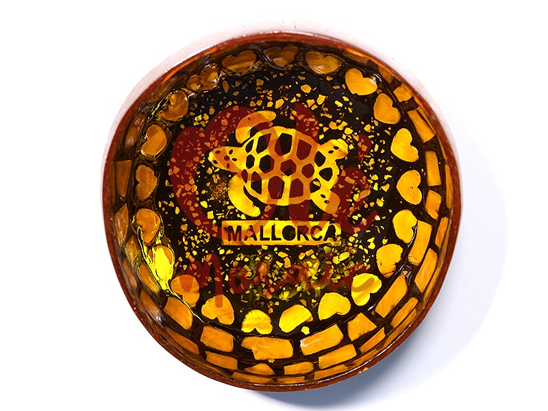 Bol de coco amarillo adornado con un diseño de tortuga encantador, que representa la rica cultura de Mallorca. Este original bol, hecho de coco, presenta un acabado brillante con detalles dorados y un marco de corazones. En el centro, destaca una tortuga grabada, junto con la palabra «MALLORCA», lo que lo convierte en un recuerdo ideal para evocar la belleza de esta isla mediterránea. Perfecto para decoración o para servir aperitivos.