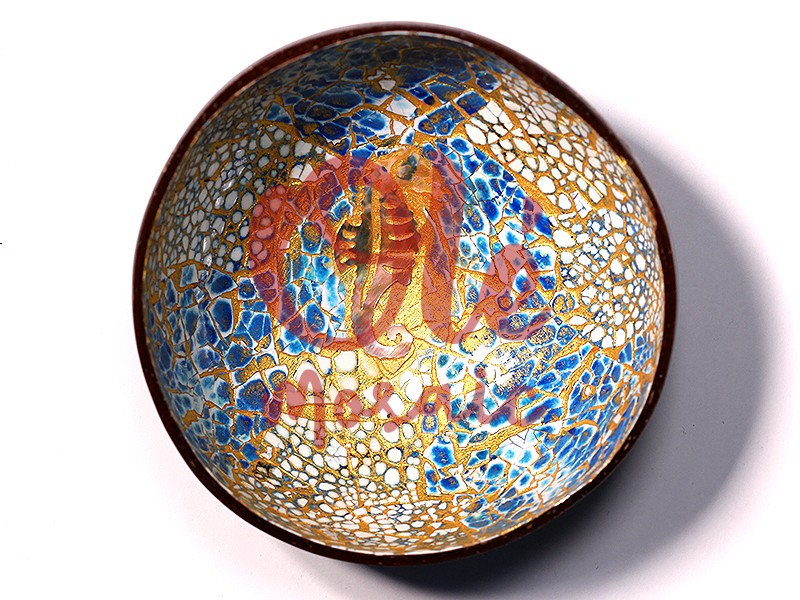Bol de coco azul decorado con un elegante caballito de mar, que representa la vibrante belleza del fondo marino. Este producto, hecho de coco, destaca por su detallado diseño artesanal, pintado a mano, en tonos azules y dorados, creando un efecto de mosaico que evoca el océano. La imagen central del caballito de mar añade un toque distintivo y artístico, convirtiendo este bol en una pieza ideal para decorar cualquier espacio o para regalar.