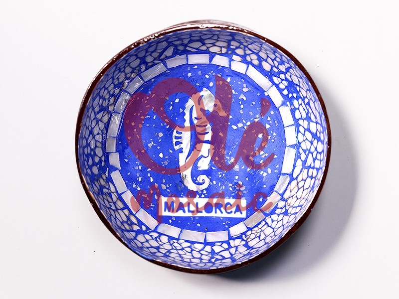 Olé Mosaic » Bols » Bol de coco azul. Caballito de mar y texto Mallorca.