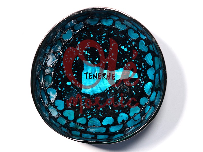 Bol de coco azul artesanal, inspirado en la isla de Tenerife. Este atractivo bol presenta un diseño en tonos azules y negros, con un festón de corazones en el borde y la silueta de la isla en un vibrante azul claro en el centro. La palabra «TENERIFE» está inscrita en un color que contrasta, creando un efecto visual llamativo. Perfecto para decorar y aportar un toque canario a cualquier ambiente.