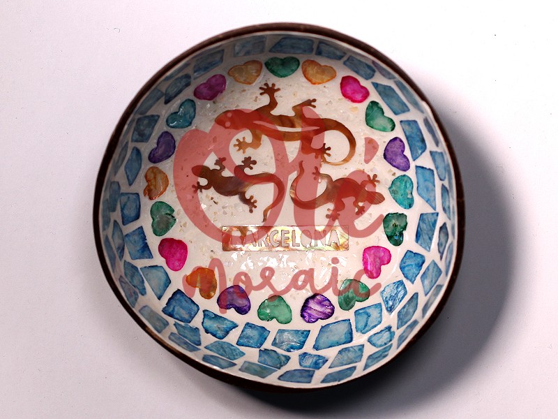 Bol de coco azul decorado con un mosaico colorido inspirado en la fauna barcelonesa. Este atractivo bol presenta tres salamandras en tonos terracota, rodeadas de vibrantes corazones y piezas de cerámica en azul y verde. La inscripción «Barcelona» en el centro destaca con un acabado brillante. Ideal para servir aperitivos o como elemento decorativo, este bol combina funcionalidad y diseño artístico, evocando la rica cultura catalana.