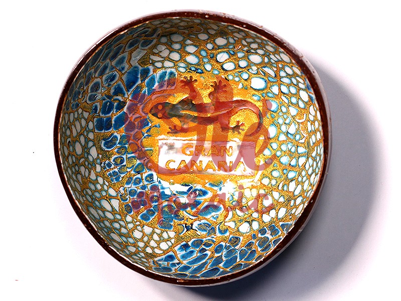 Bol de coco azul, decorado con un diseño de salamandra, típico de Gran Canaria. Este elegante bol destaca por su acabado brillante y su pintura a mano, donde el dorado resalta sobre un fondo azul vibrante y una red de texturas que evocan la naturaleza de la isla. Con la inscripción «Gran Canaria», es una pieza ideal para aportar un toque de arte canario a cualquier hogar.