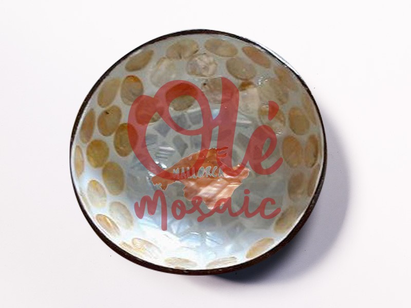 Bol de coco beige hecho a mano, inspirado en la belleza de Mallorca. Este encantador cuenco presenta un exquisito diseño de mosaico en tonos beige, con luminosos detalles que evocan calidez y elegancia. La superficie brillante resalta la textura natural del coco, mientras que en el centro se dibuja un mapa de la isla, que añade un toque distintivo. Ideal para decoración o para servir aperitivos, este cuenco combina arte y funcionalidad, capturando el espíritu mediterráneo.