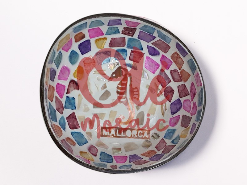 Bol de coco decorado con un mosaico colorido que incluye un encantador caballito de mar, reflejo de la esencia de Mallorca. Este precioso bol presenta un diseño artesanal, pintado a mano, con pequeñas teselas de diversos colores, que crean un efecto vibrante y atractivo. En el centro, destaca la palabra «MALLORCA» en un tono cálido, que complementa la paleta cromática. Perfecto como recuerdo o para darle un toque mediterráneo a cualquier hogar.