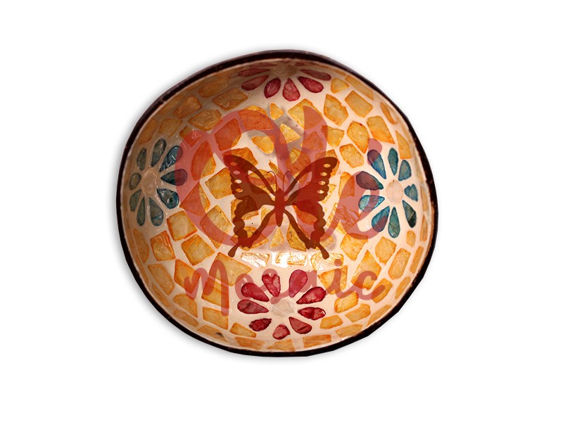 Bol de coco decorado con mosaicos de flores y mariposa