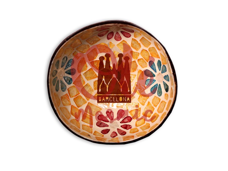 Este bol de coco decorado es un auténtico recuerdo de Barcelona que fusiona la belleza natural con el arte catalán. Su diseño pintado a mano presenta una base clara adornada con delicados mosaicos en vibrantes tonos naranjas, azules y rosas, que evocan el colorido espíritu de la ciudad. En el centro, destaca la icónica imagen de la Sagrada Familia, uno de los monumentos más emblemáticos de Barcelona, rodeada de motivos florales que realzan su estética única. El texto «Barcelona» está dibujado con un diseño estilizado que unifica la pieza, ideal tanto para uso decorativo como para complementar una mesa.