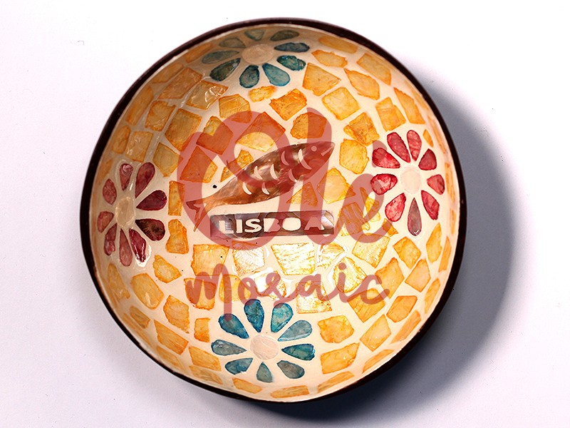 Bol de coco decorado con un vibrante mosaico floral, símbolo del colorido folclore lisboeta. Este atractivo bol presenta, en su centro, una sardina acompañada de la palabra «LISBOA» en letras claras. Su diseño incorpora piezas de cerámica en tonos amarillos, rojos y azules, que evocan la esencia brillante de la ciudad. Hecho a mano, este bol es ideal para servir o como un elegante elemento decorativo que aportará un toque portugués a cualquier hogar.