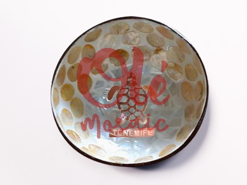 Bol de coco en tonos beis, decorado con una tortuga en el centro que representa la fauna marina de Tenerife. Este elegante bol presenta una técnica de mosaico con pequeñas piezas que simulan escamas, y su acabado brillante resalta los colores naturales del coco. Ideal como elemento decorativo o para servir, añade un toque exótico y auténtico a cualquier ambiente. Perfecto para los amantes de la naturaleza y la cultura canaria.