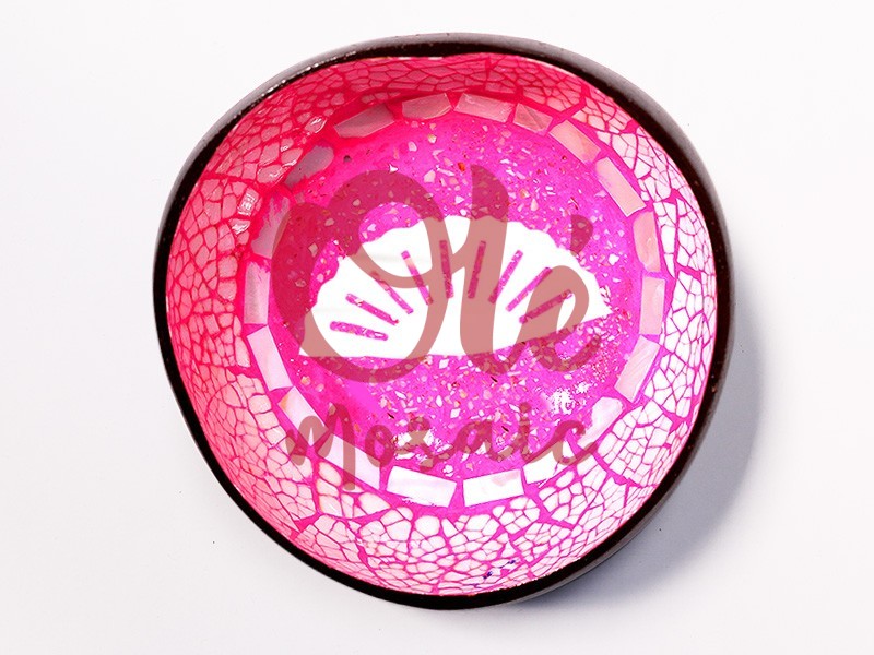 Bol de coco fucsia, hecho a mano, que destaca por su color vibrante y diseño contemporáneo. Presenta un motivo decorativo de abanico enmarcado por un mosaico de tonos rosas y detalles blancos. La técnica empleada asegura un acabado único y artesanal, ideal para dar un toque de elegancia y frescura a cualquier ambiente. Perfecto como complemento decorativo o para usar a diario en la mesa.