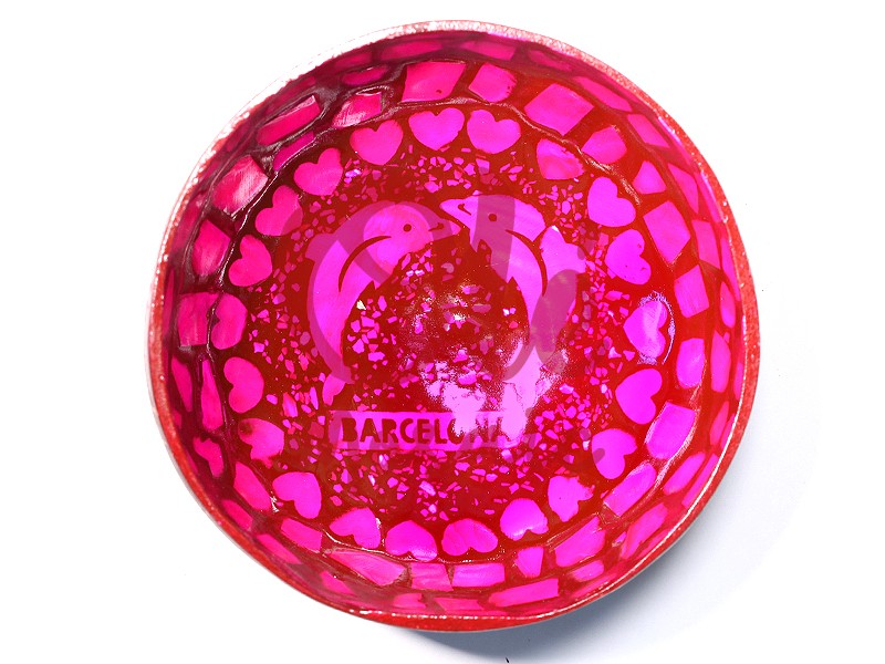 Bol de coco fucsia, decorado con una alegre ilustración de delfines y motivos de corazones, que evoca el espíritu vibrante de Barcelona. Este elegante bol, elaborado a partir de la cáscara del coco, presenta un diseño artesanal, pintado a mano, lo que le da un toque artístico y único, ideal para cualquier hogar. La palabra «Barcelona» destaca en el centro, convirtiéndolo en un recuerdo perfecto de esta icónica ciudad mediterránea.