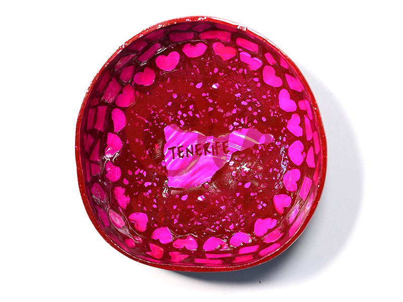 Bol de coco fucsia decorado con motivos alegres y coloridos, inspirado en la vibrante isla de Tenerife. Este encantador artículo, diseño artesanal, pintado a mano, presenta un diseño de corazones en tonos fucsias y un contorno rojo brillante. En el centro, destaca la silueta de la isla junto a la inscripción «TENERIFE». Perfecto como souvenir o elemento decorativo, este bol incorpora la esencia de la cultura canaria en cada detalle, añadiendo un toque de color a cualquier espacio.