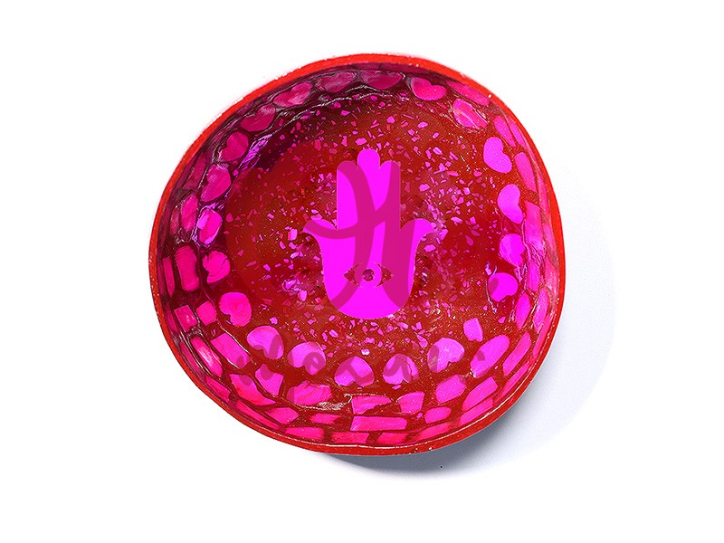 Este bol de coco fucsia es una exquisita pieza artesanal que encapsula la vibrante cultura mediterránea, ideal para decorar y organizar pequeños objetos con un toque de originalidad. Con un brillante tono fucsia que resalta su acabado pulido, este bol presenta un cautivador diseño central de la mano de Fátima, un símbolo universal de protección y buena fortuna. La mano, adornada con un ojo, destaca sobre un fondo radiante que irradia energía positiva. El borde del bol, decorado con delicados corazones, añade un toque de amor y calidez, convirtiéndolo en una pieza no solo funcional, sino también estéticamente atractiva.