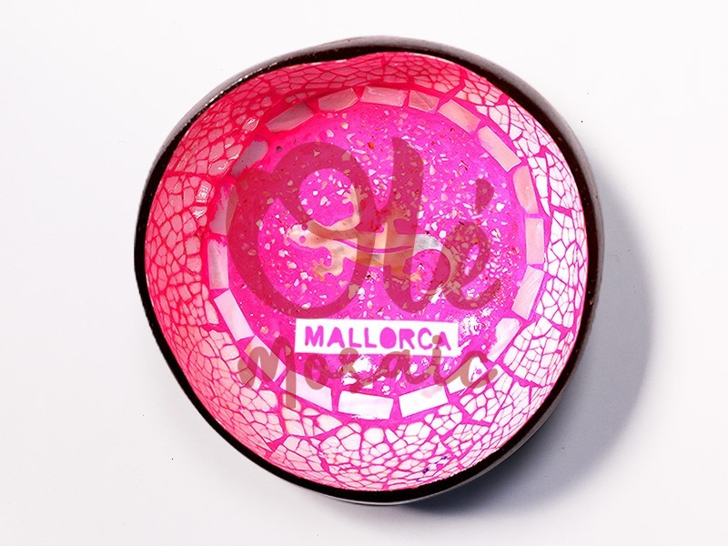 Bol de coco fucsia decorado con una salamandra, representativo de Mallorca. Este llamativo bol presenta un vibrante fondo fucsia con una salamandra en el centro, y está embellecido con un acabado de mosaico en tonos crema. La palabra «MALLORCA» destaca, haciendo alusión a su origen. Elaborado a partir de cáscara de coco, es ideal para dar un toque único y colorido a cualquier rincón de tu hogar.