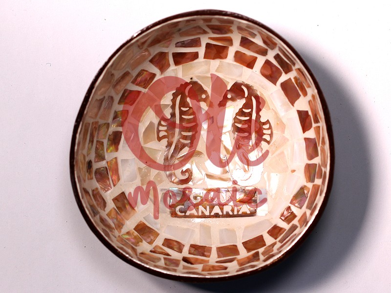 Bol de coco marrón decorado con un mosaico que representa dos caballitos de mar, un motivo característico de Gran Canaria. Este original recuerdo ensalza la cultura canaria a través de su elaborado diseño, donde se combinan tonos marrones y dorados en un acabado brillante. La técnica del mosaico le da un toque distintivo y artesanal, convirtiéndolo en una pieza decorativa ideal para cualquier hogar o como un regalo simbólico de las Islas Canarias.
