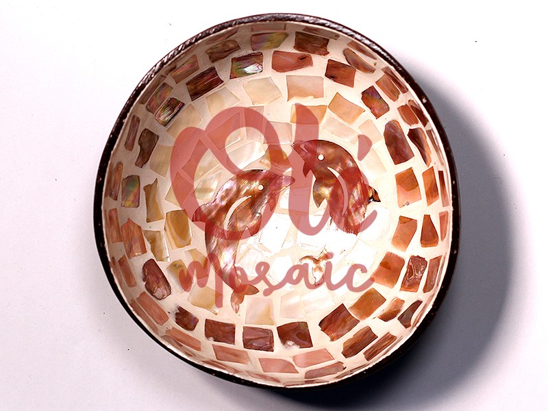 Bol de coco marrón decorado con un elegante mosaico de conchas que representa dos delfines sobre un fondo claro. Este exclusivo bol, hecho a mano, presenta piezas de concha en tonos crema y marrón, creando un hermoso contraste con la estructura de coco en su borde. La escena central captura la esencia del mar, perfecto para servir aperitivos o como elemento decorativo en cualquier hogar. Ideal para quienes buscan un toque de estilo náutico y artesanal.