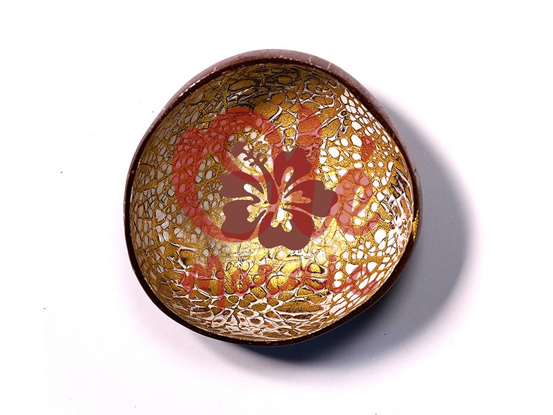 Bol de coco marrón decorado con un elegante diseño de hibisco. Este producto artesanal presenta una superficie dorada brillante con un sutil acabado craquelado, que combina la calidez del coco natural con la sofisticación de los tonos dorados. Ideal como centro de mesa o para servir aperitivos, su diseño único realza la belleza de la flora tropical, convirtiéndolo en un auténtico símbolo del estilo natural y exótico en el arte decorativo.