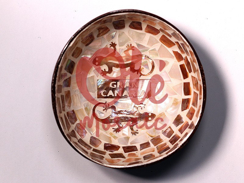 Bol de coco marrón decorado con motivos típicos de Gran Canaria. Este atractivo bol presenta un elaborado diseño en nácar, con dos salamandras marrones sobre un fondo claro y la inscripción «GRAN CANARIA». Su forma circular y su acabado brillante lo convierten en una pieza única, ideal para decorar cualquier estancia o como recuerdo representativo de la rica cultura canaria.