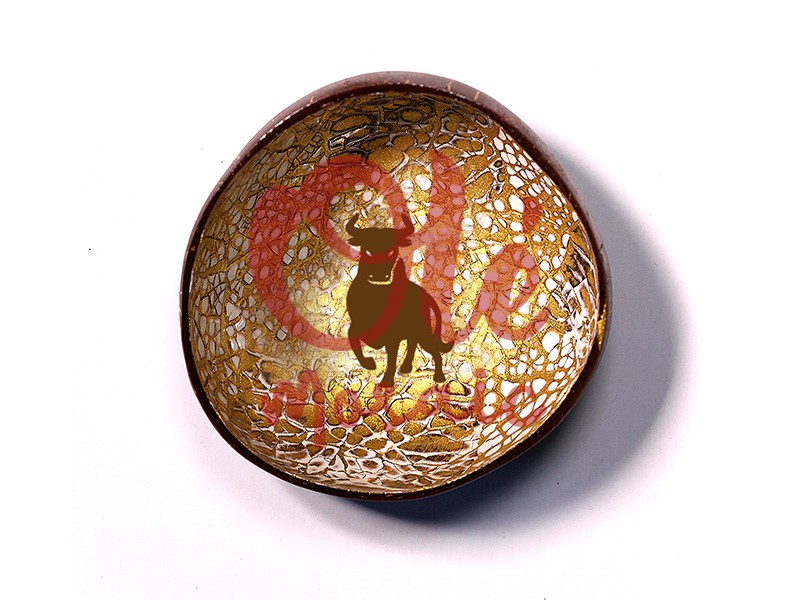 Bol de coco marrón decorado con la silueta de un toro, un símbolo emblemático de la cultura española. Este exclusivo bol presenta un acabado brillante en tonos dorados que resalta su originalidad, mientras que el exterior de coco mantiene un diseño orgánico y rústico. Ideal para servir aperitivos o como elemento decorativo, este artículo captura la esencia del folclore español en un objeto práctico y artístico.