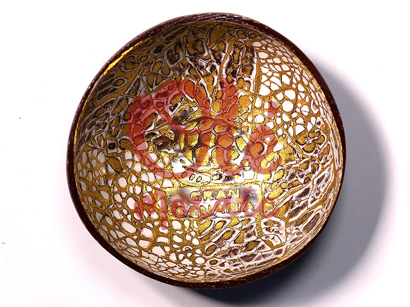 Bol de coco marrón decorado con una tortuga, un ejemplo del estilo artesanal de Gran Canaria. Este elegante cuenco presenta un diseño intrincado con colores marrones y detalles dorados que simulan el caparazón de la tortuga. En el centro, la inscripción «Gran Canaria» añade un toque distintivo y representativo de la isla. Ideal tanto para decoración como para uso funcional, es un recuerdo perfecto que refleja la belleza cultural de las Islas Canarias.