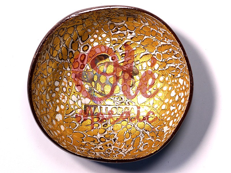 Bol de coco marrón decorado con una encantadora tortuga, que evoca la belleza del océano de Mallorca. Este producto, elaborado a mano, destaca por su diseño artístico y los llamativos detalles dorados, que realzan el motivo marino. La superficie presenta un intrincado patrón que recuerda las texturas naturales del caparazón de la tortuga, convirtiéndolo en una pieza decorativa ideal y un recuerdo auténtico de las vibrantes costas mallorquinas.