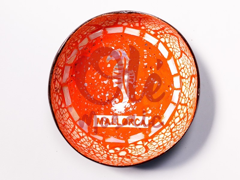 Bol de coco de un vibrante naranja, decorado con un delicado caballito de mar en el centro, que representa la belleza marítima de Mallorca. Este artículo exclusivo, elaborado a mano, destaca por su diseño artístico y su técnica única, que combina elementos tradicionales. El borde está adornado con un elegante patrón que realza los colores brillantes, y la palabra «MALLORCA» se imprime de forma distintiva. Ideal como recuerdo o elemento decorativo.