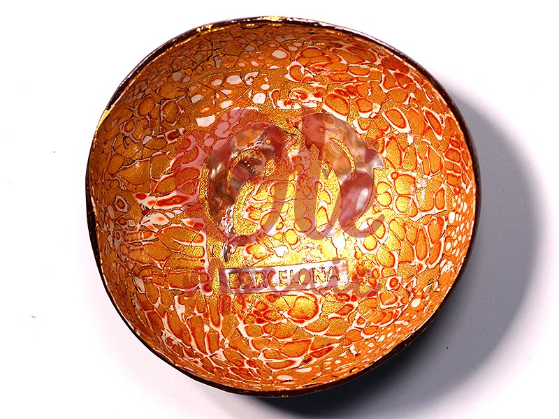 Bol de coco naranja decorado con dos delfines y la palabra «Barcelona». Este atractivo recuerdo representa la esencia del Mediterráneo, con su diseño en tonos naranjas brillantes que evocan los atardeceres junto al mar. La pieza está hecha a partir de cáscara de coco, con detalles pintados a mano que resaltan los delfines en movimiento. Ideal para aportar un toque exótico y cálido a cualquier espacio.