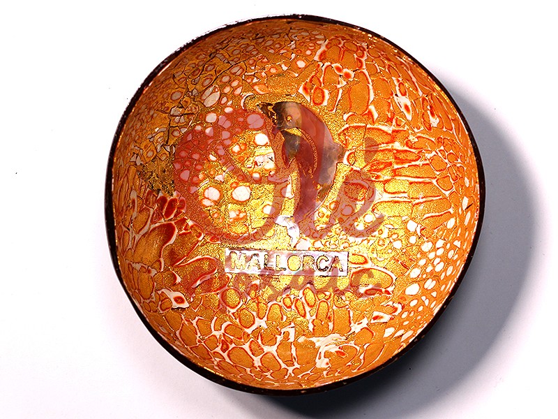 Bol de coco diseño artesanal, pintado a mano, en color naranja, decorado con un elegante diseño de delfín que representa la belleza marina de Mallorca. Este producto artesanal destaca por su textura distintiva y sus matices coloridos, que reflejan la luz de manera cautivadora. En el centro, luce un emblema con la palabra «MALLORCA», lo que lo convierte en un souvenir ideal, perfecto para realzar la esencia de la isla y añadir un toque distintivo a cualquier hogar.