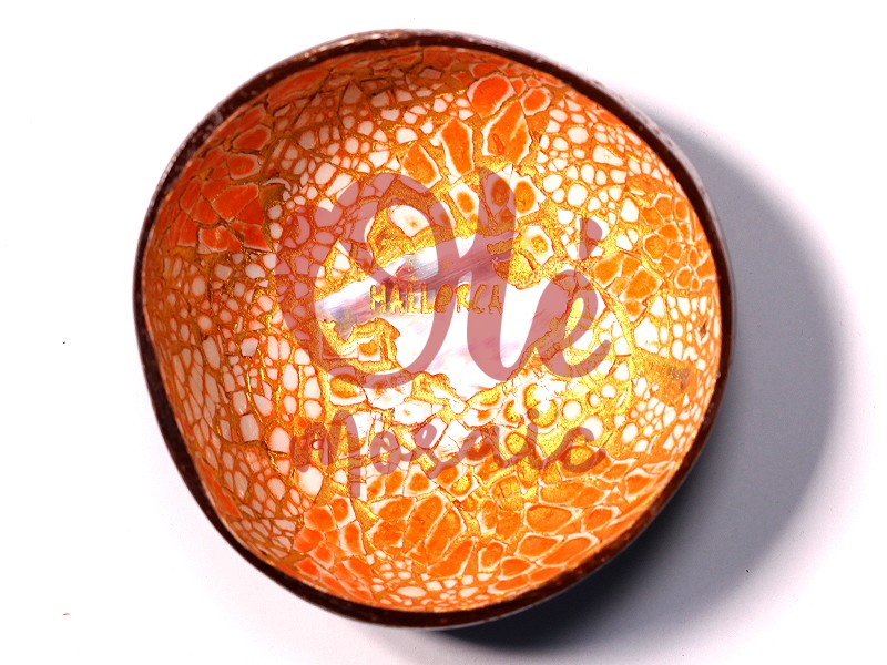 Bol de coco naranja, artesanal y característico de Mallorca. Esta pieza única destaca por su diseño interior en tonos naranjas y dorados, que imitan la textura del coral. En el centro del bol, la silueta de la isla de Mallorca resalta con destellos dorados. Fabricado a partir de cáscara de coco, es ideal como elemento decorativo o para servir aperitivos, aportando un toque auténtico y exótico a cualquier mesa.