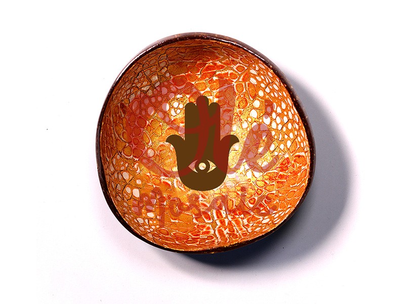 Bol de coco naranja, hecho a mano, con un diseño único que destaca por su textura brillante y cálida. Este bol presenta una elegante ilustración de la mano de Fátima, símbolo de protección y buena suerte. La superficie exhibe un acabado artesanal que realza sus tonalidades naranjas y doradas, convirtiéndolo en una pieza decorativa ideal para añadir un toque cultural y bohemio a cualquier espacio. Perfecto como centro de mesa o para exhibir pequeños objetos.