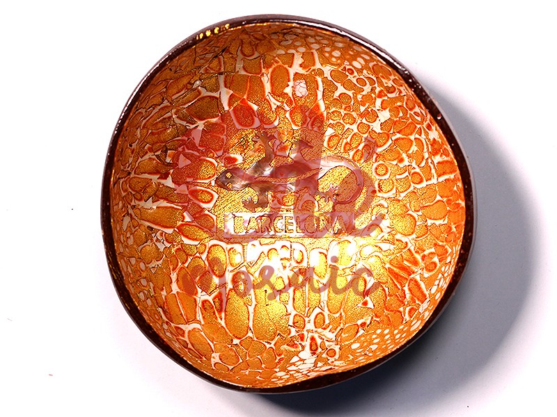 Bol de coco naranja inspirado en la emblemática salamandra de Barcelona, un símbolo del modernismo barcelonés. Este atractivo bol, hecho a partir de cáscara de coco, presenta un diseño artesanal, pintado a mano, con vibrantes tonos naranjas y detalles dorados que evocan la calidez mediterránea. En el centro, la ilustración de la salamandra destaca con la inscripción «Barcelona», capturando la esencia del arte urbano catalán. Ideal para decoración o como recuerdo.