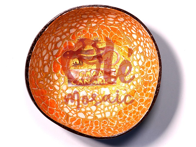 Bol de coco anaranjado decorado con un intrincado diseño en forma de malla que evoca la belleza de la naturaleza canaria. Este atractivo artículo presenta una ilustración de una salamandra en el centro, con la inscripción «Gran Canaria» en un acabado dorado que resalta sobre el fondo vibrante. Hecho a mano, este bol no solo es un recuerdo perfecto de Gran Canaria, sino que también añade un toque exótico y cultural a cualquier espacio.