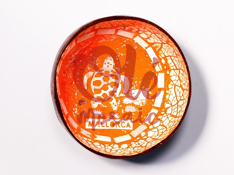 Bol de coco de color naranja, decorado con una entrañable ilustración de una tortuga, inspirado en la belleza marina de Mallorca. Este elegante bol presenta un diseño artesanal con detalles grabados que realzan su forma orgánica y su textura natural. La inscripción «MALLORCA» en la parte inferior le da un toque distintivo, mientras que los elementos decorativos evocan la vida marina local, convirtiéndolo en un recuerdo ideal para quienes deseen rememorar su paso por la isla.