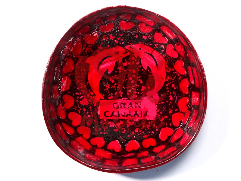 Bol de coco rojo decorado con motivos de delfines, que representa la belleza marina de Gran Canaria. Este vibrante bol presenta una base negra adornada con corazones rojos y dos delfines en un elegante diseño central, creando un atractivo visual. Fabricado de forma artesanal, es ideal como pieza decorativa o para servir aperitivos, aportando un toque de color y cultura canaria a cualquier espacio.