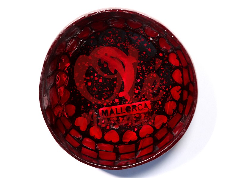 Bol de coco rojo decorado con un delfín, un símbolo de la soleada isla de Mallorca. Este atractivo bol, de elaboración artesanal, presenta un diseño vibrante con un fondo rojo y un delfín en el centro. Alrededor, pequeños corazones en tonos más oscuros le añaden un toque alegre. La inscripción «MALLORCA» evoca el encanto mediterráneo, siendo ideal como recuerdo o para decorar cualquier espacio.