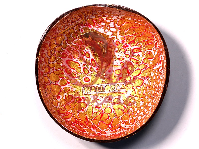 Bol de coco diseño artesanal, pintado a mano, con un llamativo diseño en tonos rojos y dorados, inspirado en la belleza marina de Mallorca. Este elegante accesorio presenta una ilustración de un delfín en el centro, junto con el nombre «MALLORCA» resaltado en dorado. Su acabado brillante y los detalles artísticos lo convierten en un atractivo souvenir que evoca el encanto del Mediterráneo, perfecto para adornar cualquier espacio.