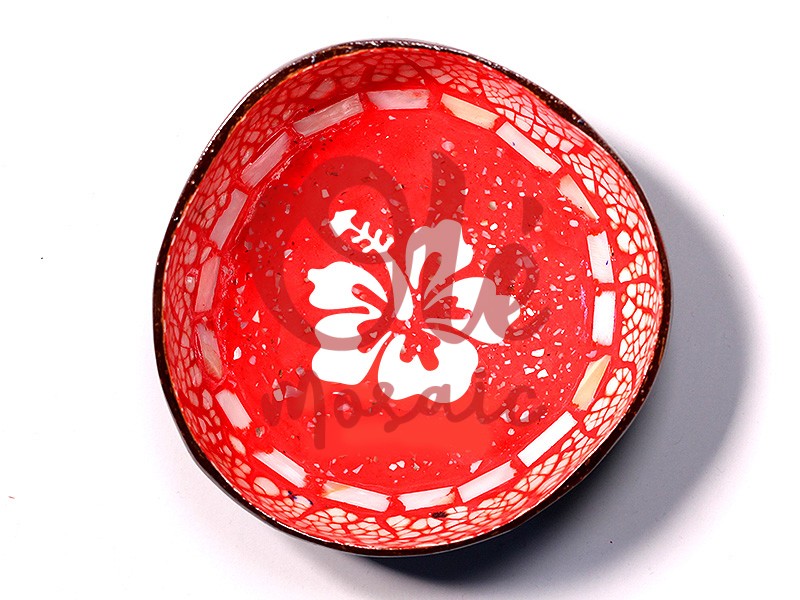 Bol de coco rojo decorado con un precioso diseño de hibisco. Este singular artículo, elaborado con cáscaras de coco, presenta un acabado brillante en un vibrante tono rojo que contrasta con el delicado motivo floral pintado en blanco en su centro. Su borde está adornado con patrones en relieve que evocan el estilo tropical, convirtiéndolo en una pieza ideal para servir aperitivos o como elemento decorativo en cualquier hogar.