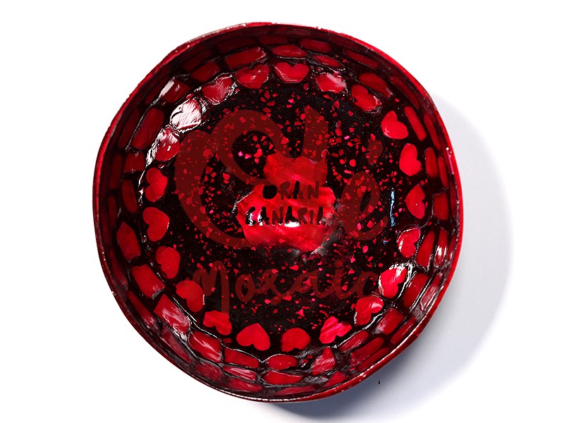 Bol de coco rojo, inspirado en la belleza de Gran Canaria. Este singular bol, hecho a partir de la cáscara de coco, presenta un vibrante acabado rojo que se combina con delicados diseños en forma de corazones. En el centro, destaca la frase «Gran Canaria» en un color negro que contrasta. Su diseño artesanal, pintado a mano, realza la esencia cultural de la isla, convirtiéndolo en una pieza única y colorida para cualquier colección.