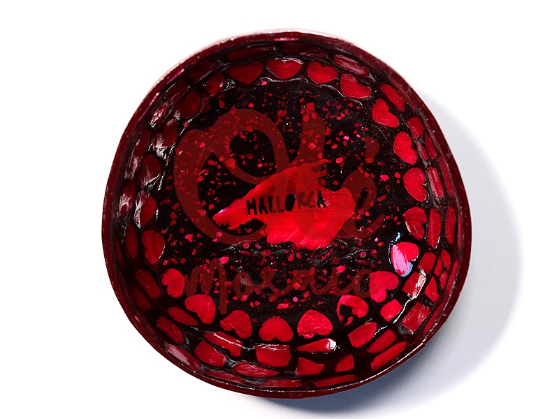 Bol de coco rojo decorado con un diseño vibrante que representa la isla de Mallorca. Fabricado a mano, este artículo presenta un fondo negro salpicado de corazones rojos y un contorno que destaca la silueta de la isla en un tono rojo intenso. La palabra «MALLORCA» está elegantemente pintada en el centro, aportando un toque cultural distintivo. Ideal como pieza decorativa o para el uso diario, combina tradición y estilo en cada rincón de tu hogar.