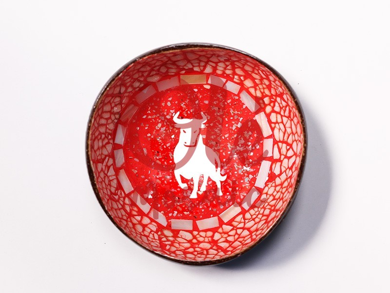 Este cuenco de coco rojo es un auténtico reflejo de la cultura española. Diseñado con un icónico toro, símbolo de la fuerza y la tradición arraigadas en el país, está fabricado con coco. Su interior, de un vibrante tono rojo, resalta la elegancia del diseño blanco del toro, creando un llamativo contraste visual que no pasará desapercibido. La atención al detalle es evidente en la delicada moldura de mosaico que enmarca el cuenco, aportando un toque distintivo que lo convierte en una pieza tanto funcional como decorativa.
