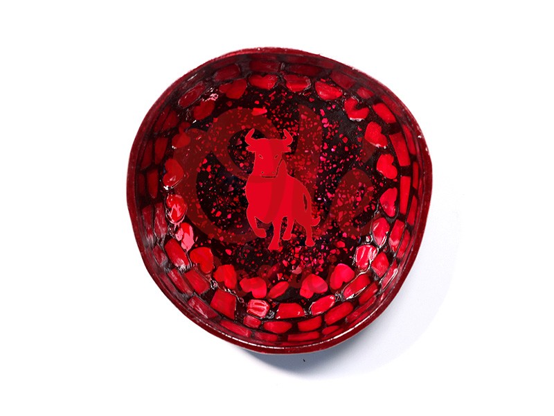 Bol de coco rojo decorado con un icónico toro, símbolo de la cultura española. Fabricado con material natural, su diseño ovalado presenta un acabado en vibrantes tonos rojos, con una superficie que resalta el motivo central del toro en rojo brillante. Los bordes del bol están adornados con pequeños corazones rojos, creando una pieza visualmente atractiva y distintiva, ideal para cualquier ambiente o como complemento decorativo.