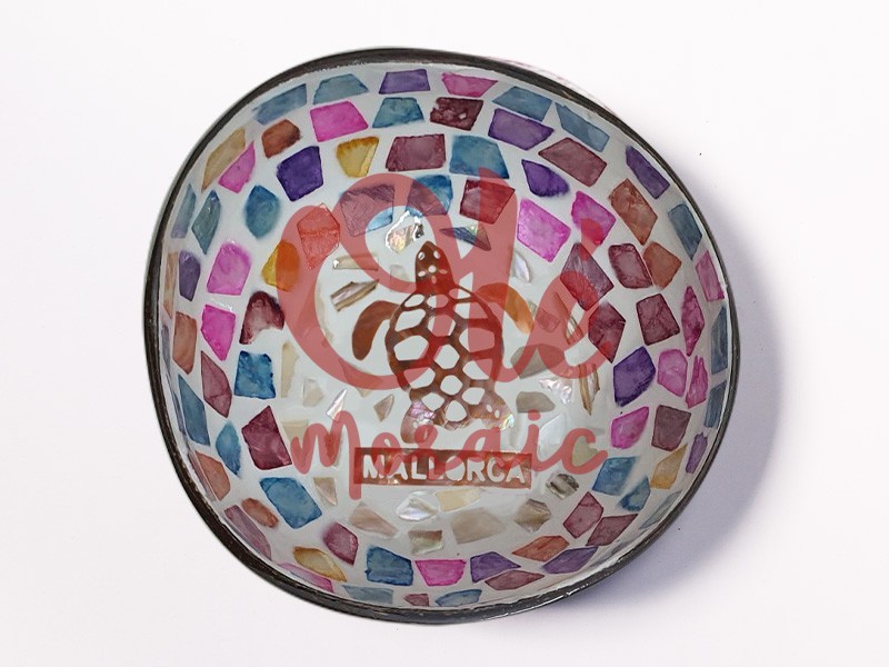 Bol decorativo de coco con diseño de tortuga, inspirado en la belleza natural de Mallorca. Este original cuenco presenta una colorida técnica de mosaico con piezas de tonos vibrantes como rosa, azul y dorado, que enmarcan un motivo central de una tortuga estilizada y la palabra «MALLORCA». Elaborado a mano, su forma ovalada y los detalles iridiscentes le dan un toque especial, convirtiéndolo en un souvenir perfecto o en un elemento decorativo ideal para el hogar.