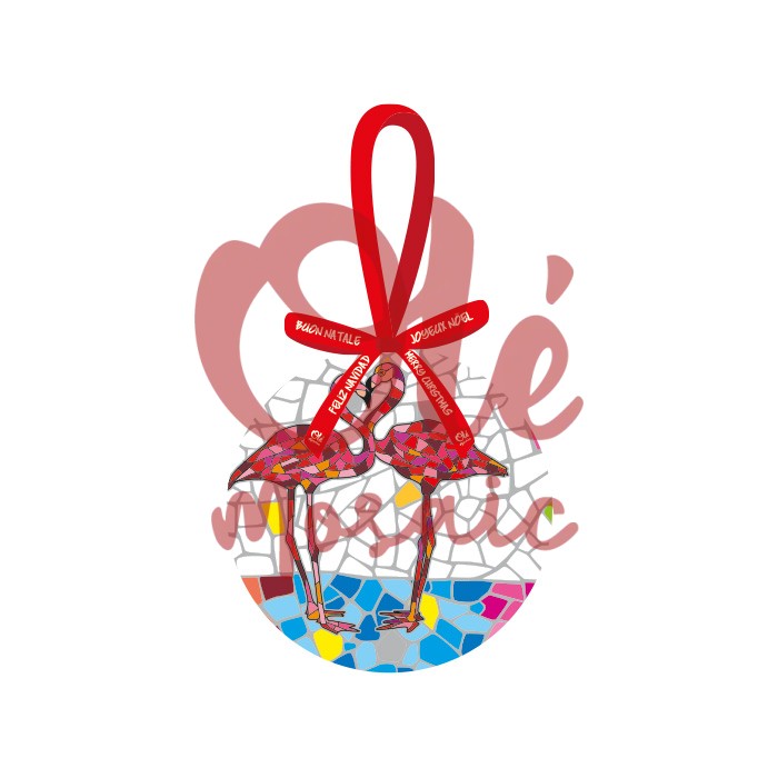 Bola de Navidad decorativa, inspirada en el emblemático flamenco, presentada en una elegante caja. Este adorno festivo cuenta con un diseño vibrante y colorido que representa dos flamencos en una composición de mosaico, utilizando tonos rojos, amarillos y azules. La bola incluye un lazo rojo para colgarla, añadiendo un toque festivo. Es ideal para quienes buscan un detalle único que refleje el folclore español en sus decoraciones navideñas.