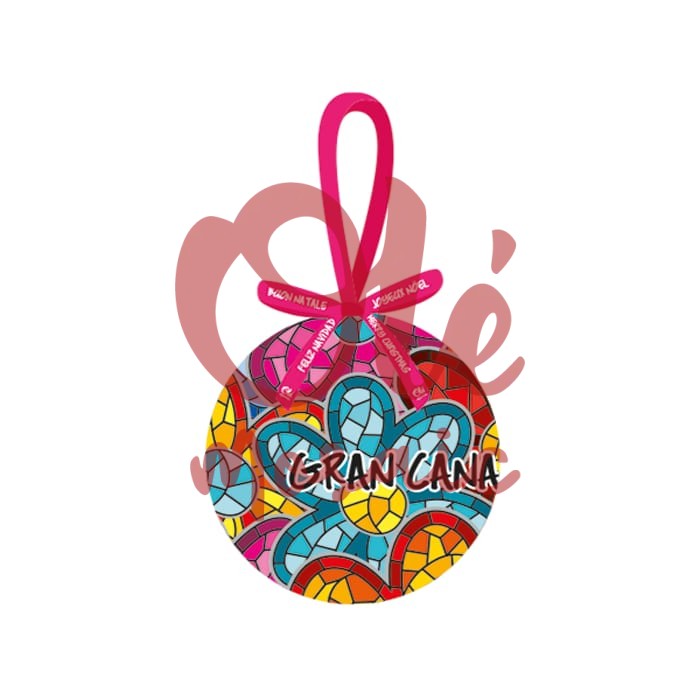 Bola de Navidad con caja, inspirada en el vibrante folclore de Gran Canaria. Este adorno colorido presenta un diseño de flores estilizadas en un llamativo mosaico que combina tonos brillantes de azul, rosa y amarillo, creando un efecto visual alegre. La palabra «Gran Canaria» destaca en un estilo moderno, añadiendo un toque contemporáneo. Viene con una elegante cinta rosa para colgar, perfecta para decorar el árbol de Navidad o como regalo especial.