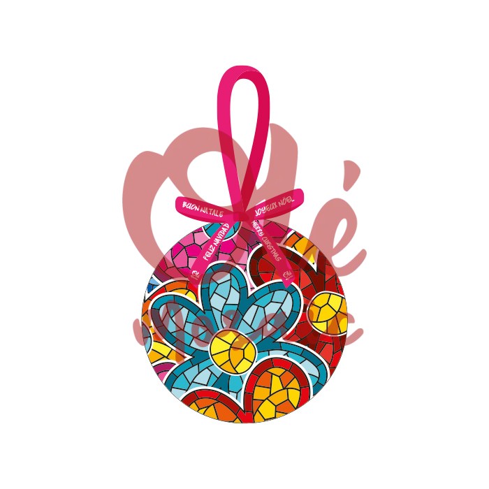 Bola de Navidad de cerámica, presentada en una caja elegante. Su diseño colorido se inspira en los vibrantes mosaicos florales, combinando tonos azules, amarillos y rojos. La decoración captura la esencia artística de festividades como las de Andalucía, con una forma redondeada que recuerda a las decoraciones tradicionales. Además, incluye un lazo rosa que facilita su colocación como adorno navideño, aportando un toque alegre a cualquier árbol.
