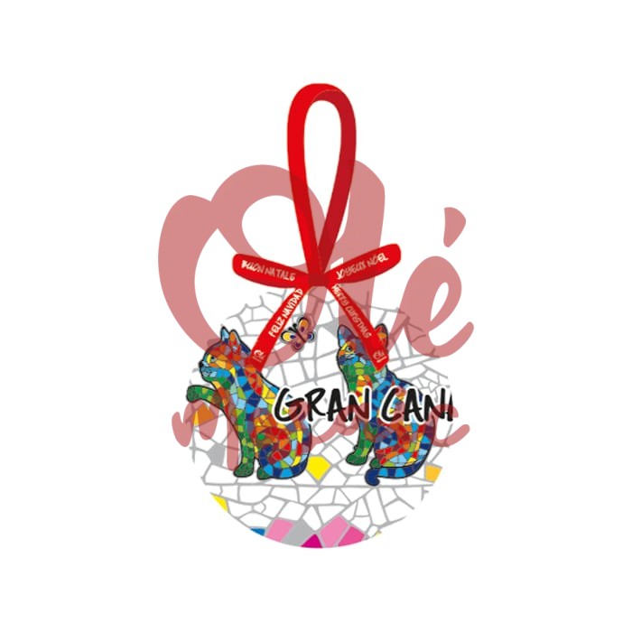 Bola de Navidad decorativa con diseño gatuno, inspirada en el arte de Gran Canaria. Fabricada en cerámica, presenta un colorido mosaico que ilustra dos gatos en tonos vibrantes, sobre un fondo de fragmentos cerámicos. El texto «GRAN CANI» destaca con una tipografía llamativa, y un lazo rojo permite colgarla fácilmente. Esta bola se presenta en una elegante caja, ideal para un regalo navideño auténtico y cultural.