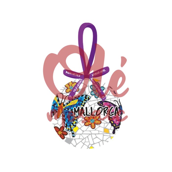 Bola de Navidad decorativa con diseño de mariposas, inspirada en la belleza de Mallorca. Este adorno esférico presenta coloridas mariposas y flores sobre un fondo de mosaico, destacando por su técnica gráfica vibrante y moderna. Incluye una elegante caja para su presentación y está adornada con una cinta morada. Es perfecta para darle un toque festivo y regional a tu árbol, o como un encantador recuerdo de las Islas Baleares.