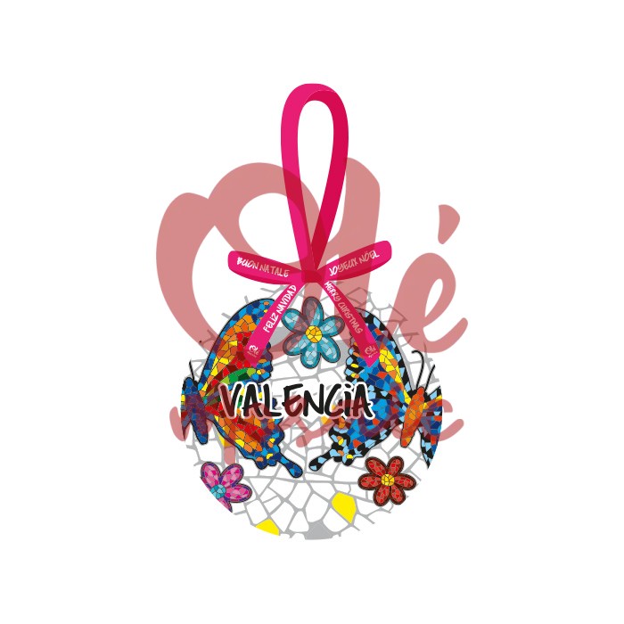 Bola de Navidad con caja, decorada con un vibrante diseño de mariposas y flores inspirado en la artesanía típica valenciana. Esta pieza, con acabado cerámico que simula el famoso mosaico de la ciudad, destaca por sus vivos colores: azul, amarillo y rojo. La bola, que lleva la inscripción «Valencia» en un estilo llamativo, incluye un lazo rosa para colgar, ideal para dar un toque festivo y cultural a tu árbol de Navidad.