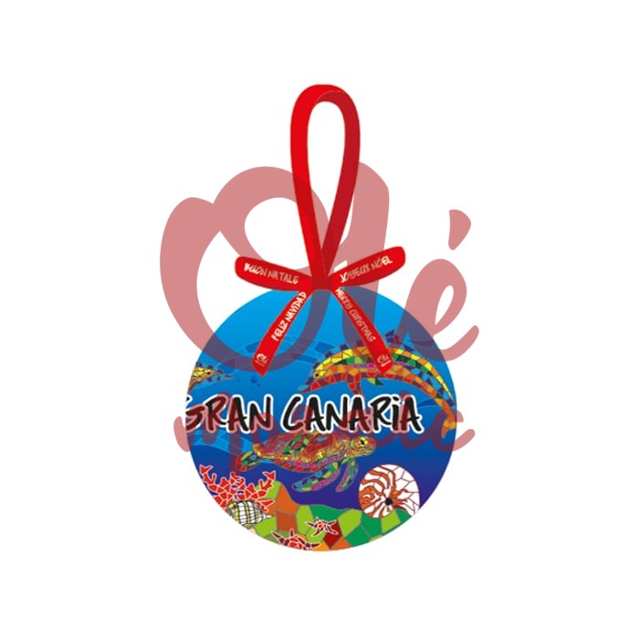 Bola de Navidad con caja, decorada con motivos marinos de Gran Canaria. Este encantador adorno de cerámica presenta una vibrante ilustración de tortugas y delfines sobre un fondo azul, evocando la rica fauna marina de la isla. La bola se realza con detalles rojos en el lazo, que le dan un toque festivo. Es ideal para decorar el árbol y recordar las bellezas de Gran Canaria durante las fiestas navideñas.