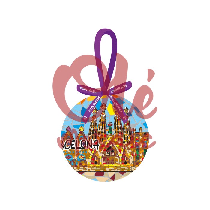 Bola de Navidad decorativa con caja, que presenta una colorida panorámica de Barcelona. Este adorno, hecho de cerámica, destaca por su vibrante diseño, que incluye la famosa Sagrada Familia rodeada de mosaicos multicolores. La bola es un homenaje a la arquitectura modernista de la ciudad y está adornada con la palabra «Barcelona». Se complementa con un lazo morado, que le da un toque festivo ideal para el árbol de Navidad.